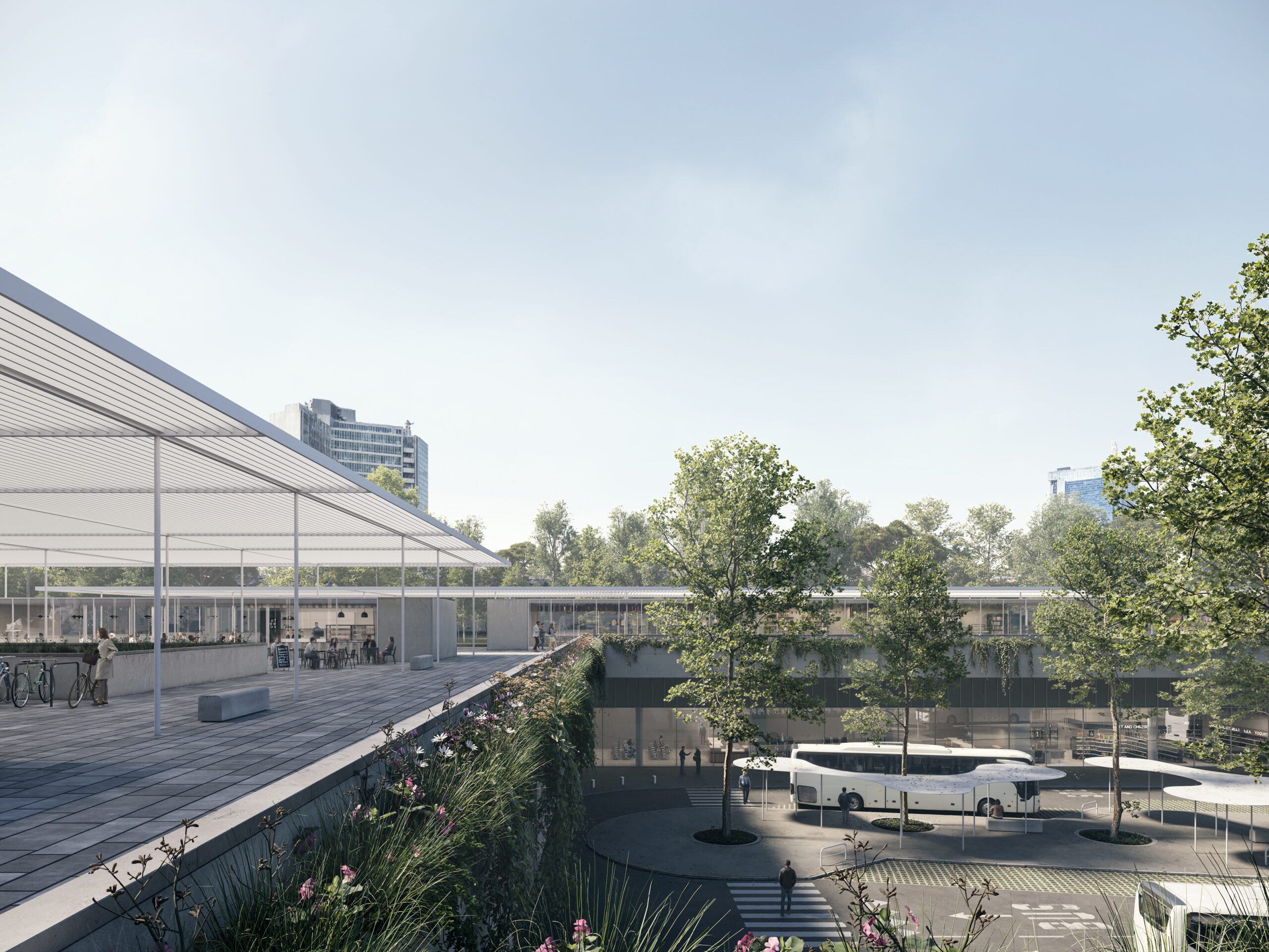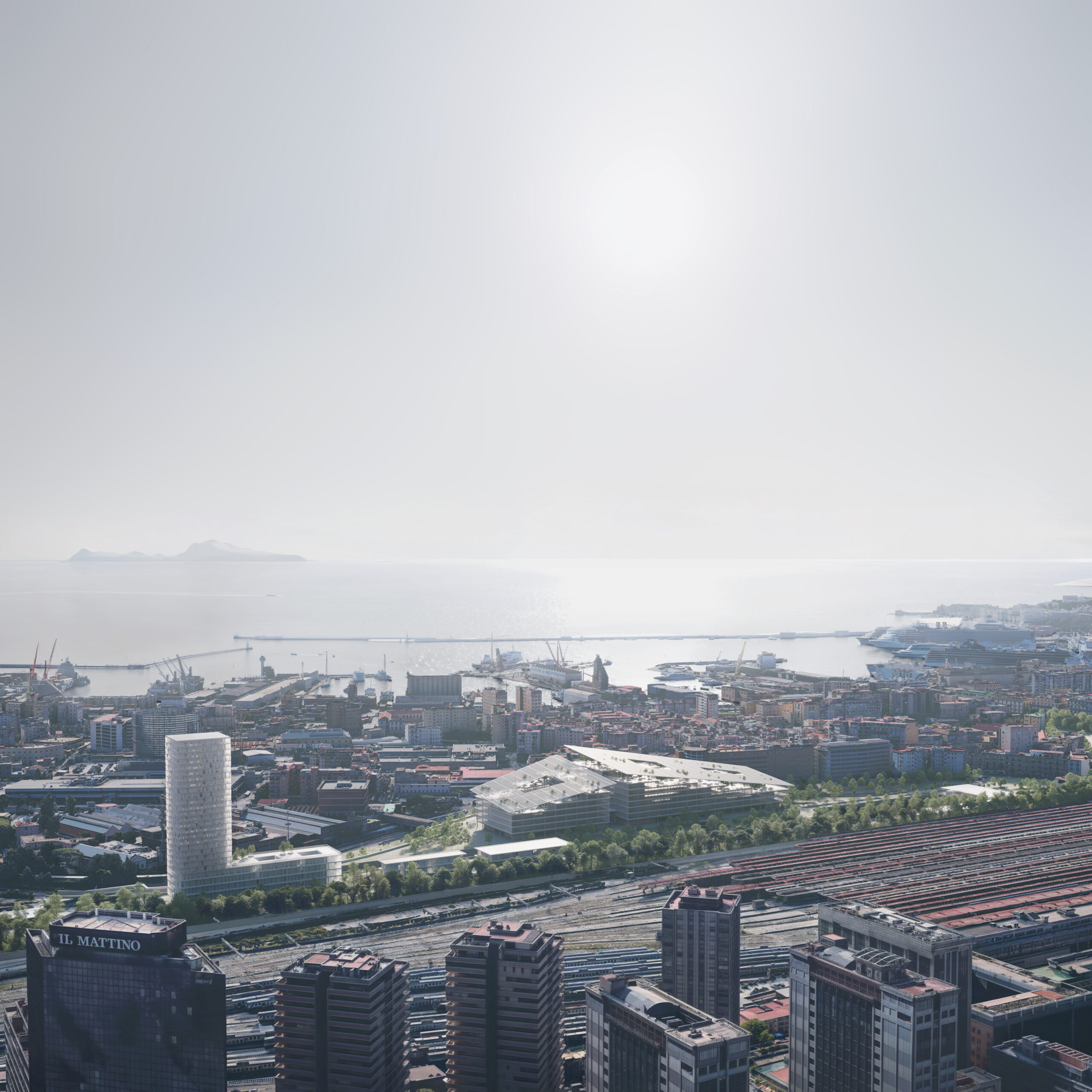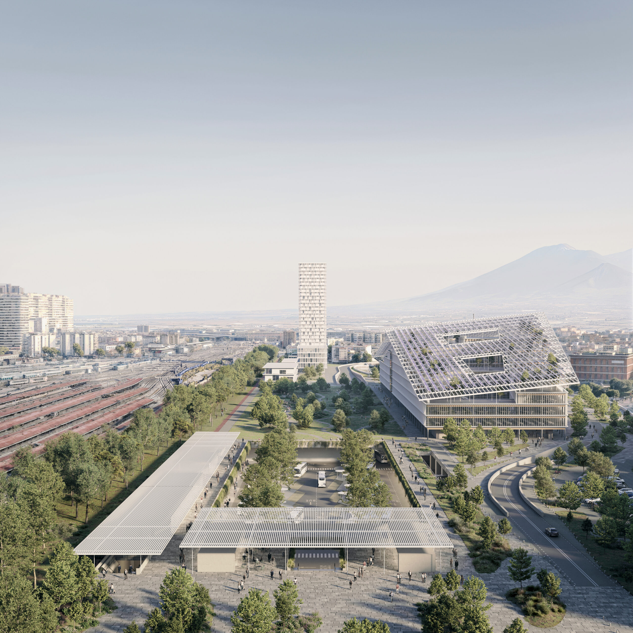 The project’s concept unfolds as a cinematic “sequence” of landscapes shaping a renewed identity for East Naples: an Urban Forest inspired by the city’s historic woodlands, a Green Flow recalling the dynamic forms of Mount Vesuvius, and a Botanical Square echoing Campania’s botanical gardens. Within this landscape framework, the new intermodal hub becomes a resilient, human-centered mobility engine integrating services and public space. The new Campania Region Headquarters, a horizontal landmark, reinforces territorial identity and creates a strong dialogue between architecture, infrastructure, and the emerging urban park system.